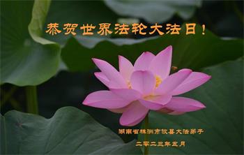 师父您好!师父辛苦了! 弟子很想念您,我们得法二十七年了,每一步都离不开师尊的保护和点悟,师尊给了我们一个健康的身心,通过拜读和背诵《为什么会有人类》、《为什么要救众生》,让我们明白了许许多多不知道的天机和做人的道理。一定修好自己,修去怕心,用真善忍归正各种人心和执着,更坦荡充实的去做好三件事,坚信师尊和大法,紧紧跟随师尊走到底。叩拜师尊的恩德。 合十 湖南省株洲市大法弟子恭贺世界大法日!