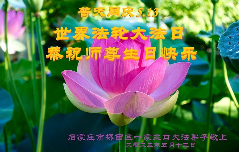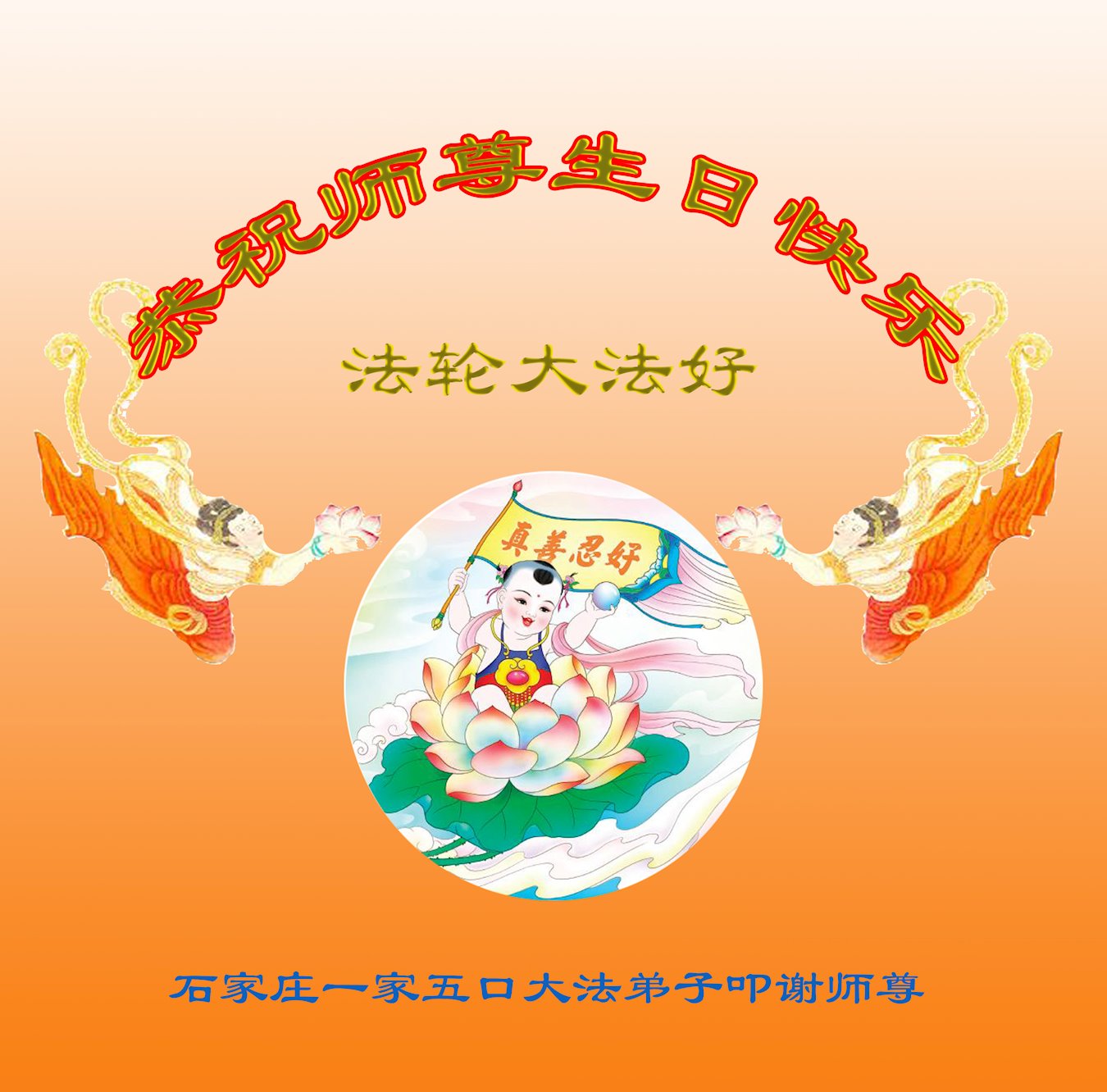 恭贺世界法轮大法日!师父生日快乐! 石家庄全体大法弟子敬上 二零二三年四月二十七日 河北省石家庄一全家五口大法弟子恭祝师尊生日快乐!
