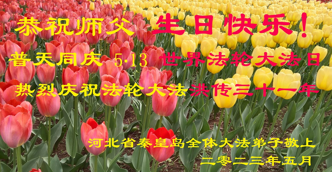 热烈庆祝5·13 世界法轮大法日!普天同庆法轮大法在全世界洪传三十一年! 秦皇岛大法弟子都应珍惜走过的修炼路,越到最后越要修好自己,越到最后越成熟,越到最后越多救人。 谢谢师父!谢谢师尊无处不在的慈悲保护! 感恩!感恩! 河北省秦皇岛地区全体大法弟子敬上 二零二三年五月 河北省秦皇岛市一学法小组大法弟子恭祝师尊生日快乐!