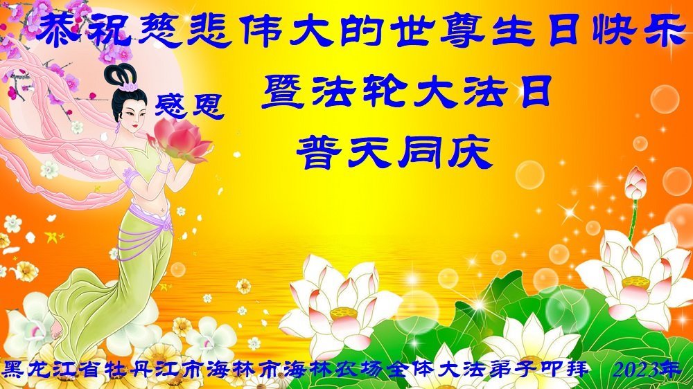在正法的最后的最后,师尊发表了两篇新经文《为什么会有人类》、《为什么要救度众生》来激励弟子们,同时唤醒着世界众生。弟子深知责任重大,千言万语也表达不了师尊慈悲救度!唯有修好自己的同时,抓紧时间救人,来回报师恩! 在世界法轮大法日、师尊华诞日来临之际,我和我的家人共同祝愿慈悲伟大的师尊生日快乐!共同庆祝世界法轮大法日!感恩师尊的慈悲救度! 黑龙江绥化一大法弟子与家人敬上 二零二三年四二十七日 黑龙江省牡丹江市海林市海林农场全体大法弟子恭祝师尊生日快乐!