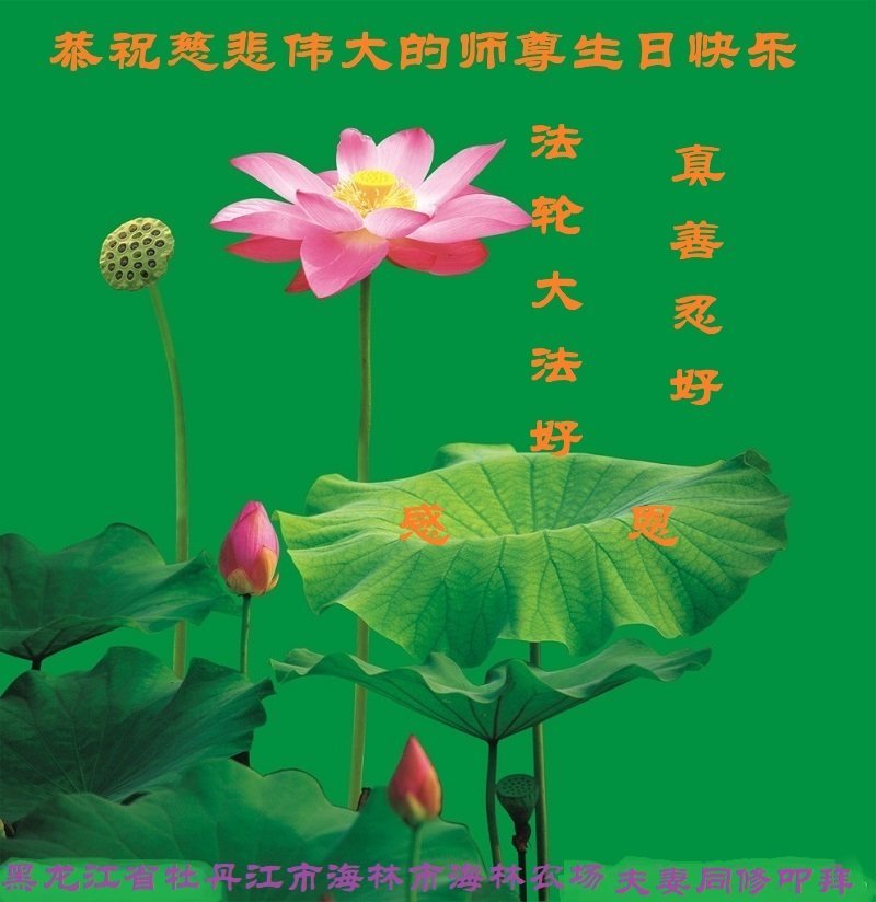 在法轮大法日到来之际,在法正人间的序幕拉开之时,首先感恩师尊的慈悲救度!ㄧ路保护!今后我们会一如既往的做好三件事,修好自己,利用多种形式多救众生,兑现誓约 ,跟师父回到自己真正的家。 全体大法弟子叩拜! 黑龙江省牡丹江市海林市海林农场夫妻大法弟子恭祝慈悲伟大的师尊生日快乐!