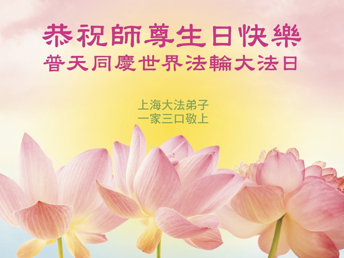 普天同庆世界法轮大法日! 尊敬的师父好! 弟子们非常感恩师尊的慈悲救度!发现学好法,实修自己,去除人心,就能看到师父安排的修炼道路,从而做好应该做的三件事。在今后的修炼中,弟子们会继续信师信法,修好自己多救人,跟随师父回家。 再次恭祝师尊生日快乐! 叩拜师尊 上海大法弟子一家三口敬上 2023年4月24日 上海一大法弟子恭祝慈悲伟大的师尊生日快乐!