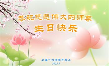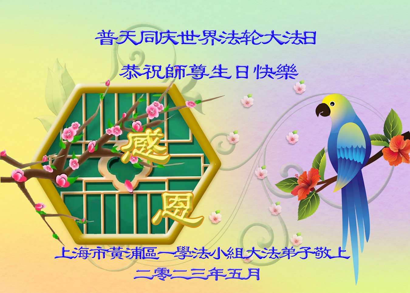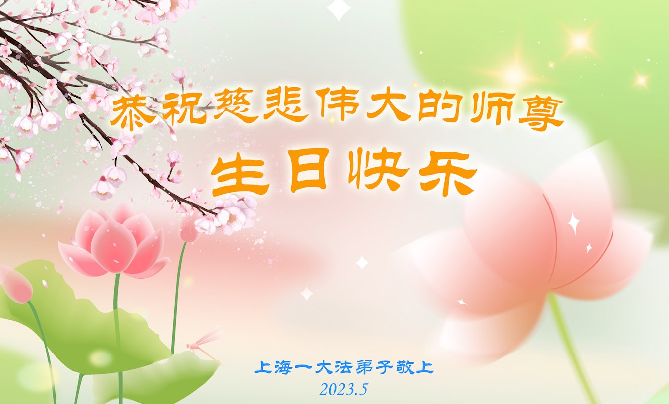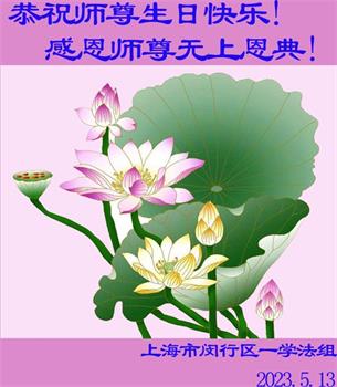 【明慧网二零二三年五月十一日】 上海市黄浦区一学法小组大法弟子恭祝师尊生日快乐!庆祝世界法轮大法日!