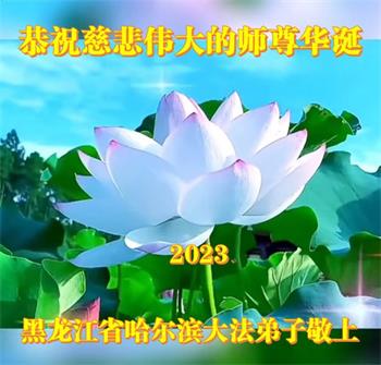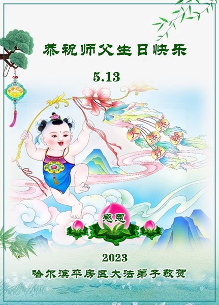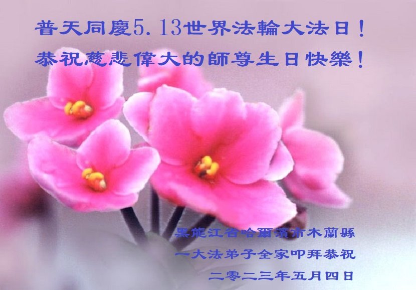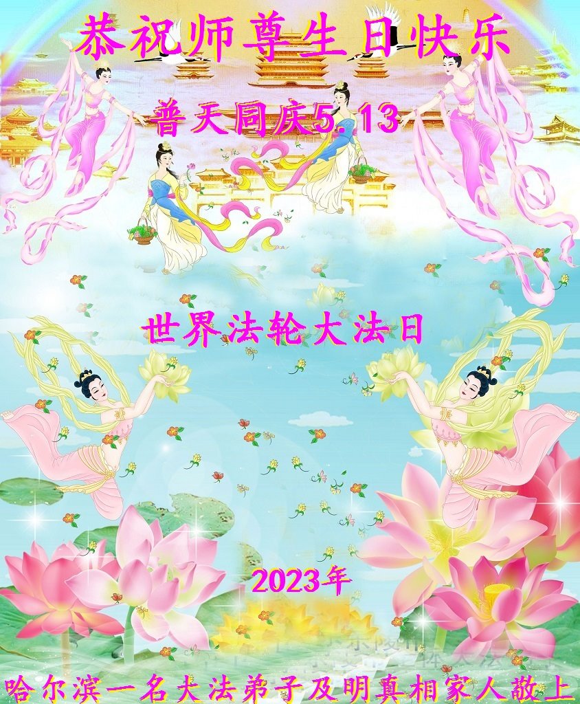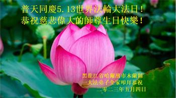 【明慧网二零二三年五月十一日】 黑龙江省哈尔滨一名大法弟子及明真相家人恭祝慈悲伟大的师尊生日快乐暨世界法轮大法日!