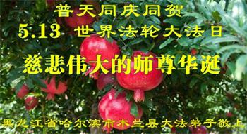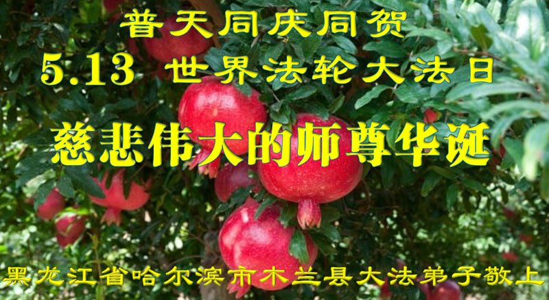 “五·一三”是慈悲伟大师尊的生日,也是世界法轮大法日。在这普天同庆、神圣、伟大的日子里,我们怀着感恩和喜悦的心情,恭祝师父生日快乐!谢谢师父慈悲救度! 哈尔滨一学法小组大法弟子的祝愿 黑龙江省哈尔滨市木兰县大法弟子同庆世界法轮大法日!