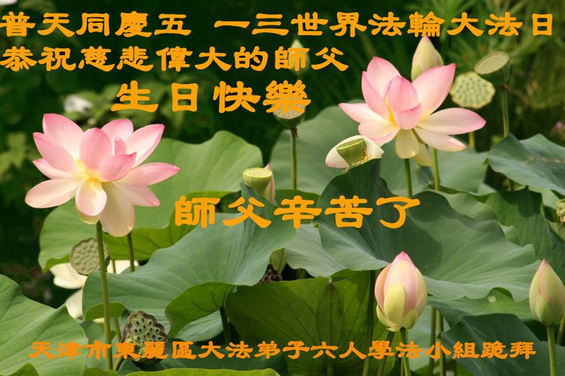 天津市东丽区六人学法小组大法弟子热烈庆祝世界法轮大法日!恭祝慈悲伟大的师父生日快乐!