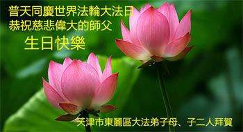 天津市北辰区学法小组两位大法弟子及家人恭贺世界法轮大法日!