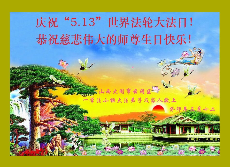 恭祝慈悲伟大的师父生日快乐!普天同庆5.13法轮大法日 山西大同市云冈区一学法小组大法弟子及家人恭祝慈悲伟大的师尊生日快乐!