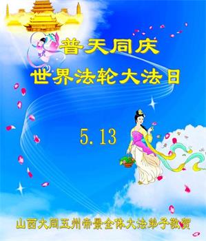 恭祝慈悲伟大的师尊华诞暨5.13世界法轮大法日! 师尊好!师尊辛苦了!为了众生师尊付出了一切,众生无法报答师尊为众生付出的万分之一。我们大法弟子唯有多学法,学好法,助师正法,多救众生来报答师尊的洪恩! 恭祝慈悲伟大的师尊生日快乐! 山西太原一家姐弟妹大法弟子恭祝 山西省大同市云州区大法弟子祝贺“五·一三”世界法轮大法日!恭祝慈悲伟大的师尊生日快乐!