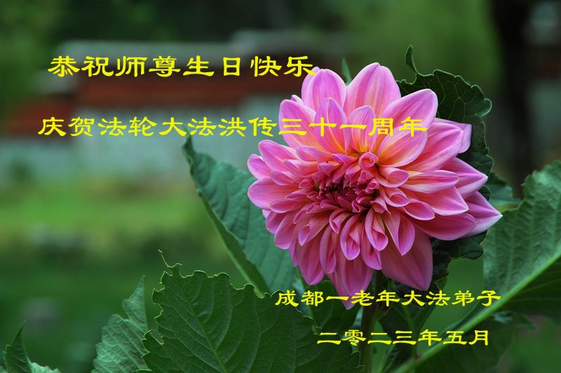 恭祝慈悲伟大的师父传法三十一周年,师父辛苦了!感恩师父!最最幸运的我得大法修炼二十七载,以法为师,修炼如初,坚信坚定助师正法,完成誓约直到修炼圆满,随师还。我的生日是五·一三,与大法有缘!最幸运、幸福的我感恩师父!我要更加精進修好自己,报师恩! 成都一大法弟子合十叩拜 四川成都一大法弟子恭贺法轮大法日!恭祝师尊生日快乐!