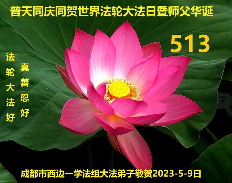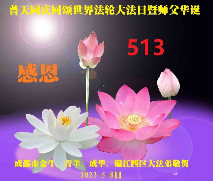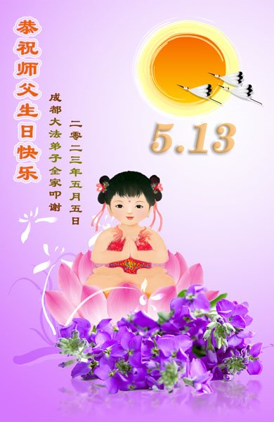 恭祝师尊生日快乐! 恭贺5·13世界法轮大法日! 庆贺法轮大法洪传三十一周年! 四川省成都大法弟子全家恭祝师父生日快乐!