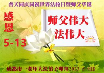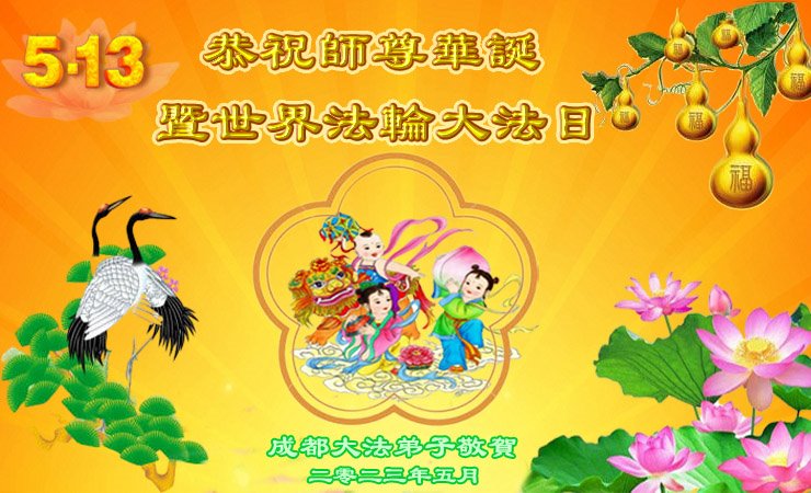 四川省成都大法弟子恭祝师父生日快乐!同庆世界法轮大法日!