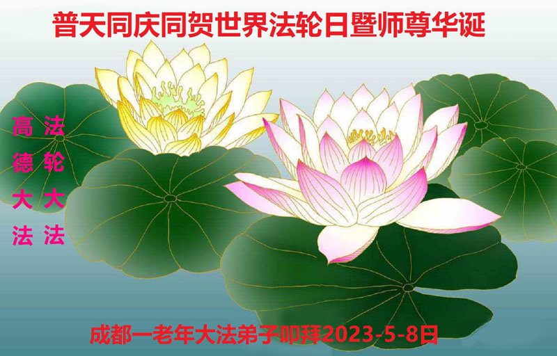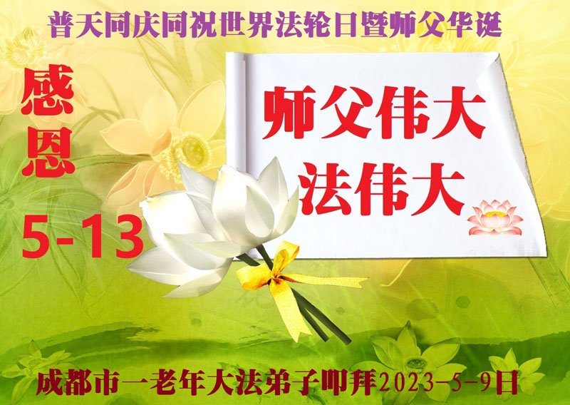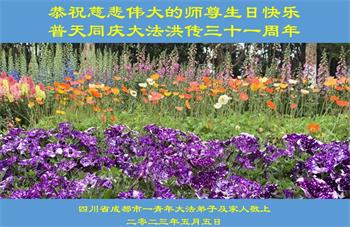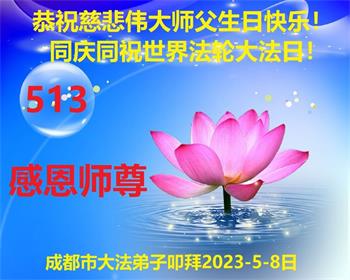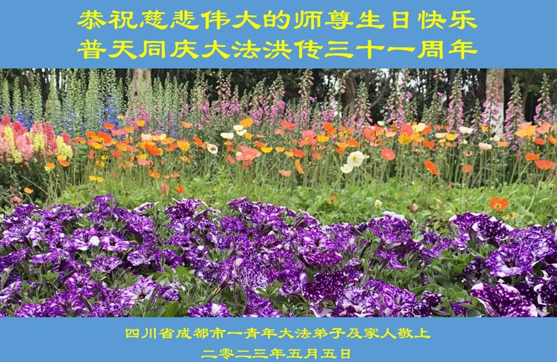 【明慧网二零二三年五月十一日】 四川省成都市青白江区城厢镇大法弟子恭祝悲慈伟大的师尊生日快乐!
