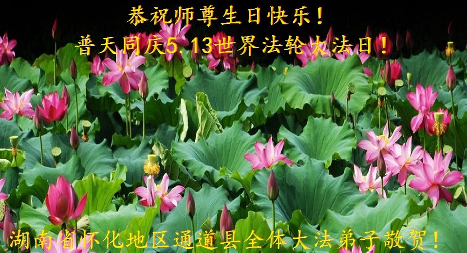 弟子全家恭祝师尊生日快乐!普天同庆5.13世界法轮大法日! 只因修了大法,家里人屡次遇到危险诚念“法轮大法好,真善忍好”都化险为夷。弟子全家感恩师尊的慈悲救度!感恩师尊保护家人!弟子唯有精進修炼,做好三件事,兑现来世的誓约。 湖南省怀化地区通道县全体大法弟子恭祝世界法轮大法日!