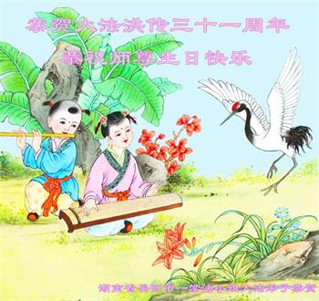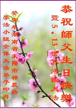 师尊好! 在普天同庆的世界法轮大法日到来之际,湖南省新晃县全体大法弟子以最最诚挚的敬意恭祝慈悲伟大的恩师生日快乐!恭贺宇宙法轮大法洪传世界三十一周年。 新晃大法弟子一定努力按照师尊最近发表的两篇新经文要求,跟上师父正法進程,保持善良,坚持传统观念,坚守正理,多学法,学好法,扎扎实实在法上实修,做好三件事,多救人。 湖南省岳阳市一大法弟子恭祝师尊生日快乐!