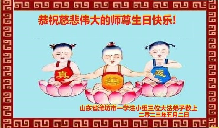 在这法轮大法日到来之际,我和俩个外孙女一起恭祝慈悲伟大的师尊生日快乐! 师父辛苦了!谢谢师父! 二零二三年五月五日 山东省潍坊市昌邑市一家大法弟子恭祝师父生日快乐!