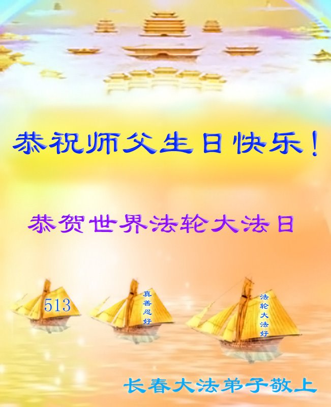 师父生日快乐!普天为您祝贺,飞鸽寄去祝愿,春风送去赞歌。 师恩心中铭刻,为救苍生尽舍,天地因您复活,得救众生欢歌。 吉林长春德惠大法弟子恭祝师尊华诞!恭贺世界法轮大法日!