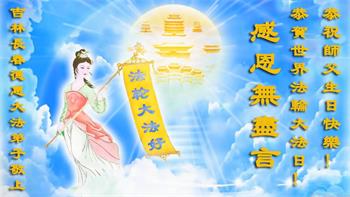 普天同庆世界法轮大法日! 恭祝师尊生日快乐! 弟子感恩师尊救度。愚钝弟子修炼二十多年到现在才知道什么是修炼、什么是为他、什么是放下、怎么样修好自己,才能更好的救度众生。 从自身的变化感受到师尊的慈悲苦度和无尽的辛劳。感恩师尊!叩拜,再叩拜! 长春大法弟子叩拜 吉林长春市大法弟子恭祝师尊生日快乐!