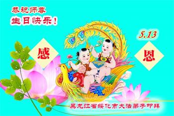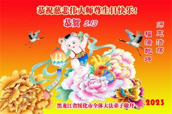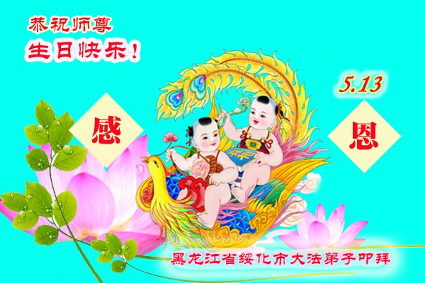 风风雨雨一路来,师恩保护时时在。 携手并肩同精進,随师正法圆满还。 黑龙江省绥化市北林区大法弟子恭祝师尊生日快乐暨世界法轮大法日!