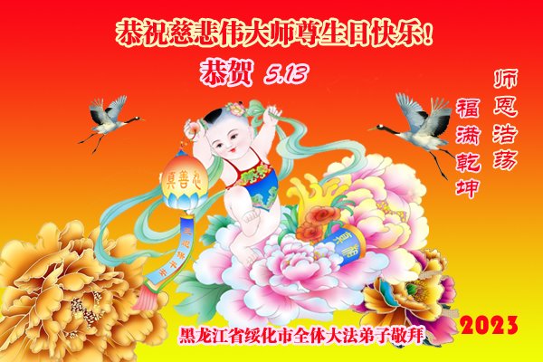 感恩师尊引领我们走上返本归真的回家之路!感恩师尊多年的慈悲保护,为弟子的提升操尽了心,弟子用尽人类的语言也表达不出对师尊的感恩之情,唯有听师尊的话,实修真修,做好三件事,不辜负师尊的慈悲苦度!叩拜师尊! 二零二三年四月二十五日 黑龙江省绥化市全体大法弟子恭祝师尊生日快乐暨世界法轮大法日!