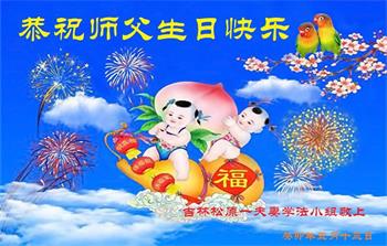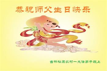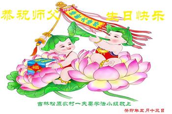 山东烟台招远金岭农村一大法弟子及家属祝贺法轮大法日!祝师父生日快乐!