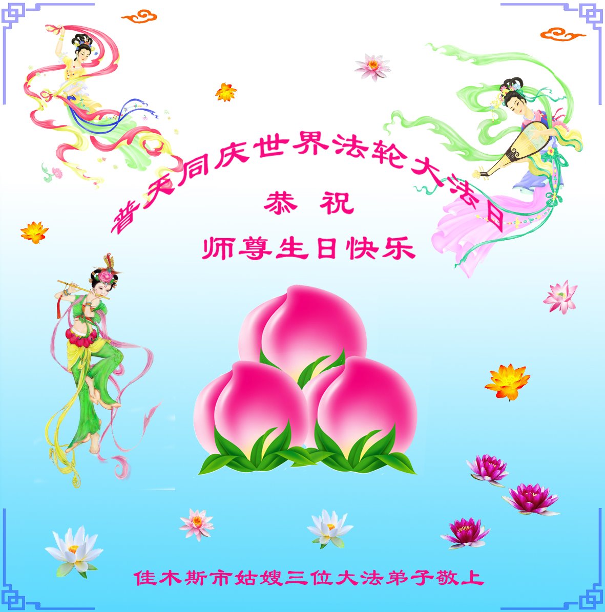 普天同庆世界法轮大法日! 大法洪传数十载 亿万弟子随师来 学法修心向内找 正法路上不停摆 改变观念多救人 众生得救谢师恩 佳木斯市近江姑嫂三人大法弟子敬上 黑龙江省佳木斯姐妹大法弟子恭祝师尊生日快乐!