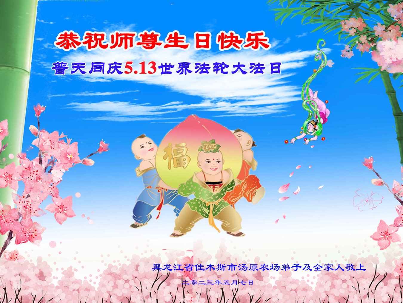 弟子全家人恭祝师尊生日快乐!感谢师尊的慈悲苦度! 黑龙江省佳木斯市汤原农场一夫妻大法弟子叩拜恩师 二零二三年五月六日 黑龙江省佳木斯一大法弟子恭祝伟大的师尊华诞!普天同庆世界法轮大法日!