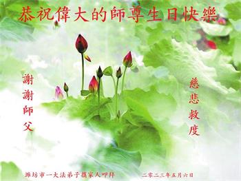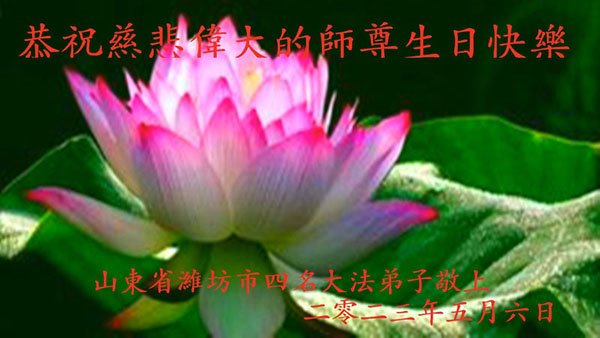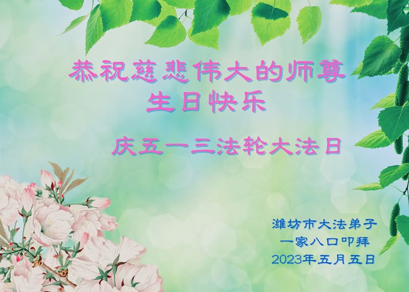 【明慧网二零二三年五月十一日】 山东省潍坊市临朐杨善大法弟子恭祝师尊华诞快乐暨世界法轮大法日!