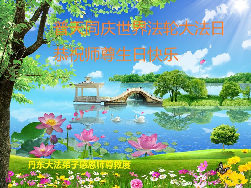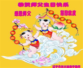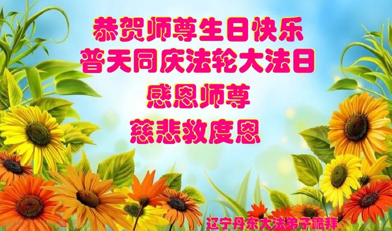 世界法轮大法日即将到来了,感恩师尊的慈悲苦度!师尊救度众生付出了自己的一切。弟子会抓紧做好三件事,多救人,完成使命,以报师恩。 我们全家恭祝伟大师父生日快乐!感谢师尊!合十 辽宁丹东一大法弟子恭祝慈悲伟大的师尊生日快乐!