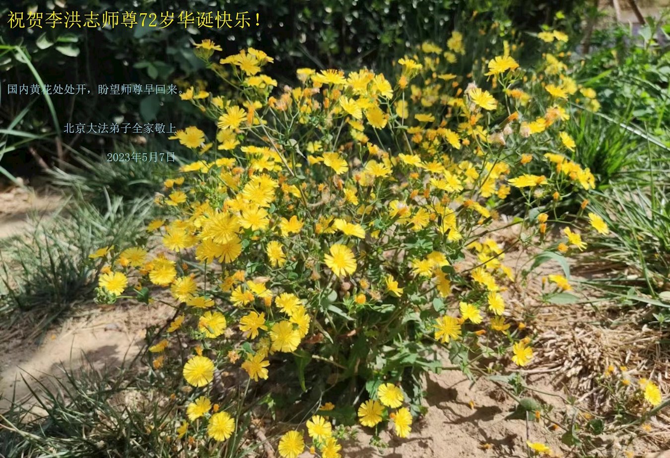今天(5月7日)上午,北京阳光明媚,在所住小区院子里,看到一处处的黄花开得茂盛,不由想起了师尊《洪吟》中提及的黄花。于是,用手机拍了图片并添加了两句话:“国内黄花处处开,盼望师尊早回来。”我们夫妻同修及全体家人遥祝师尊72岁生日快乐!感恩您的慈悲救度!师尊您辛苦啦!合十 北京大法弟子及全家人 2023年5月7日 北京市全体大法弟子恭祝师尊生日快乐!