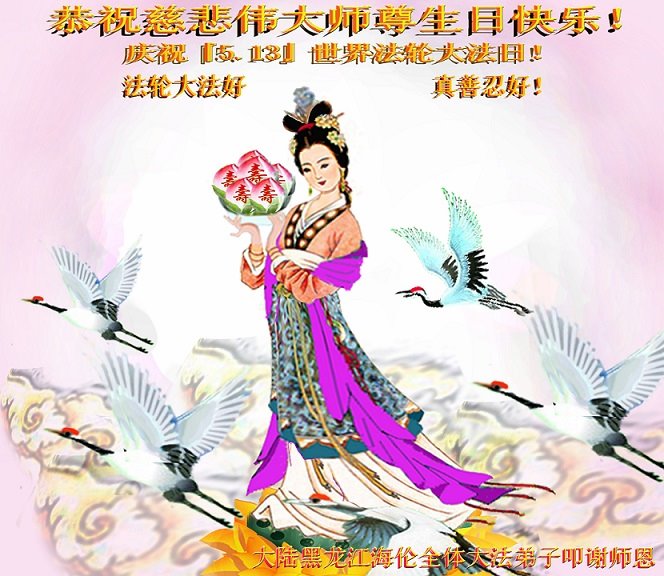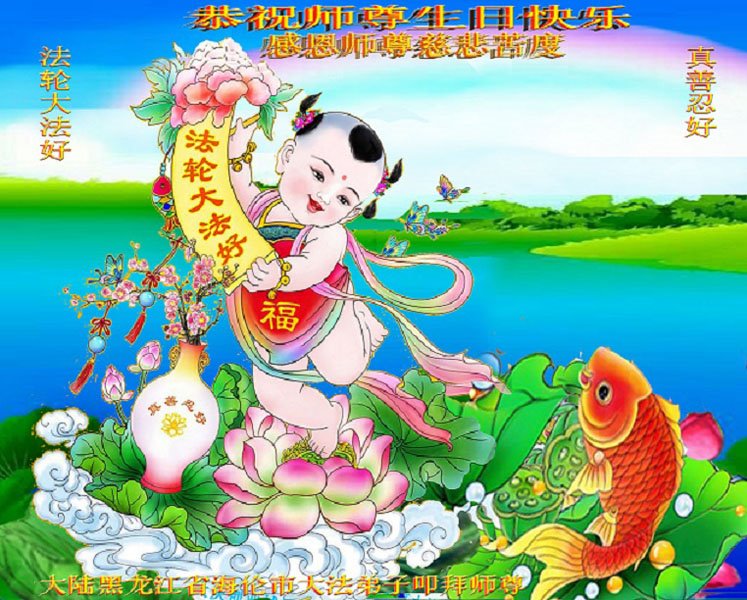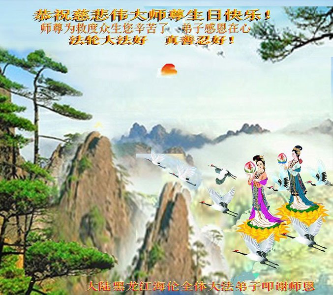 普天同庆同祝恩师生日快乐!在反复学习师父最近发表的两篇经文《为什么会有人类》和《为什么要救度众生》,在这开天辟地都没有过的救度众生中我们能成为师尊的弟子,这是何等的荣耀啊?以前师父曾多次讲过,但是就是体悟不到,师父为救众生倾尽所有,现在我深有感触了,那种发自内心深处的感触,真真切切的感受到了这一切是无法用语言表达出来的,期盼早日见到师父,可惜自己做的不好又无颜面对师父呢! 黑龙江省伊春市金山屯区大法弟子恭祝师尊生日快乐!