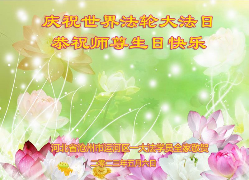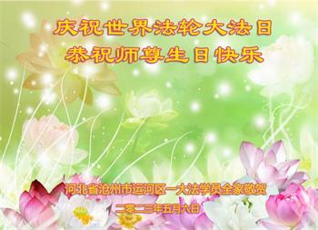 河北省沧州市运河区一大法学员全家庆祝世界法轮大法日!