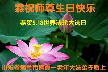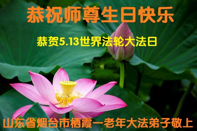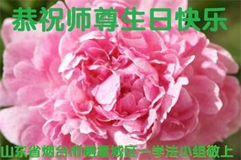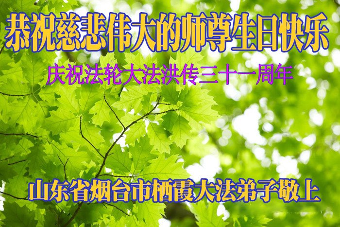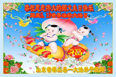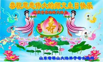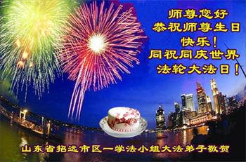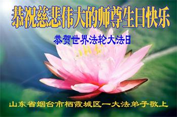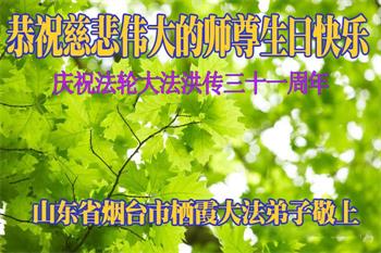 世界法轮大法日来临之际,日照全体大法弟子恭祝师父生日快乐!跪谢师父的救度之恩。弟子做好三件事,跟师父回家。山东省日照市一学法小组敬上。 山东聊城大法弟子恭祝慈悲伟大的师尊生日快乐!弟子叩拜师尊!
