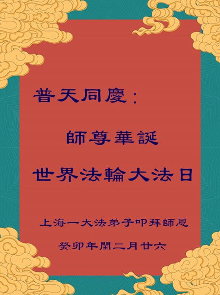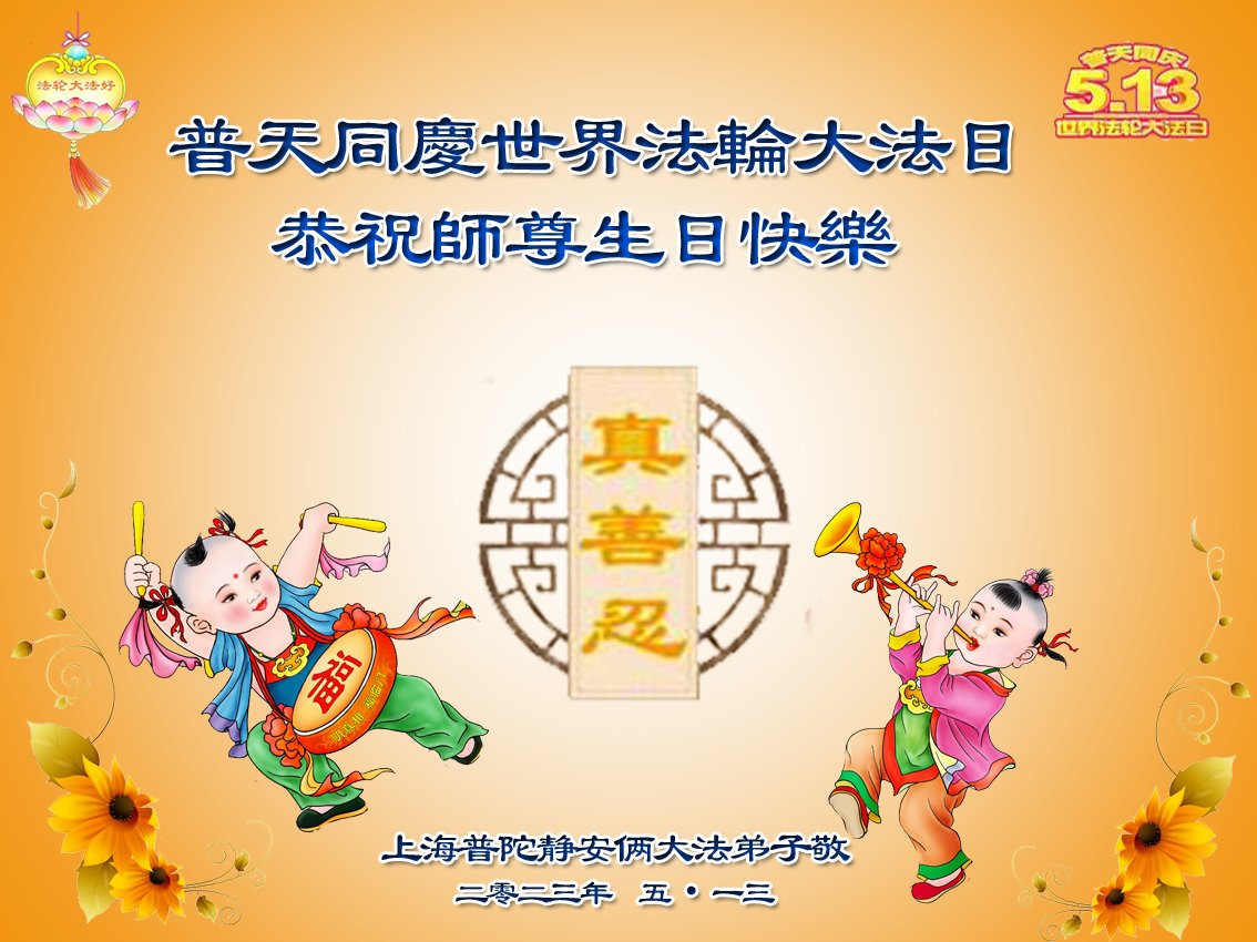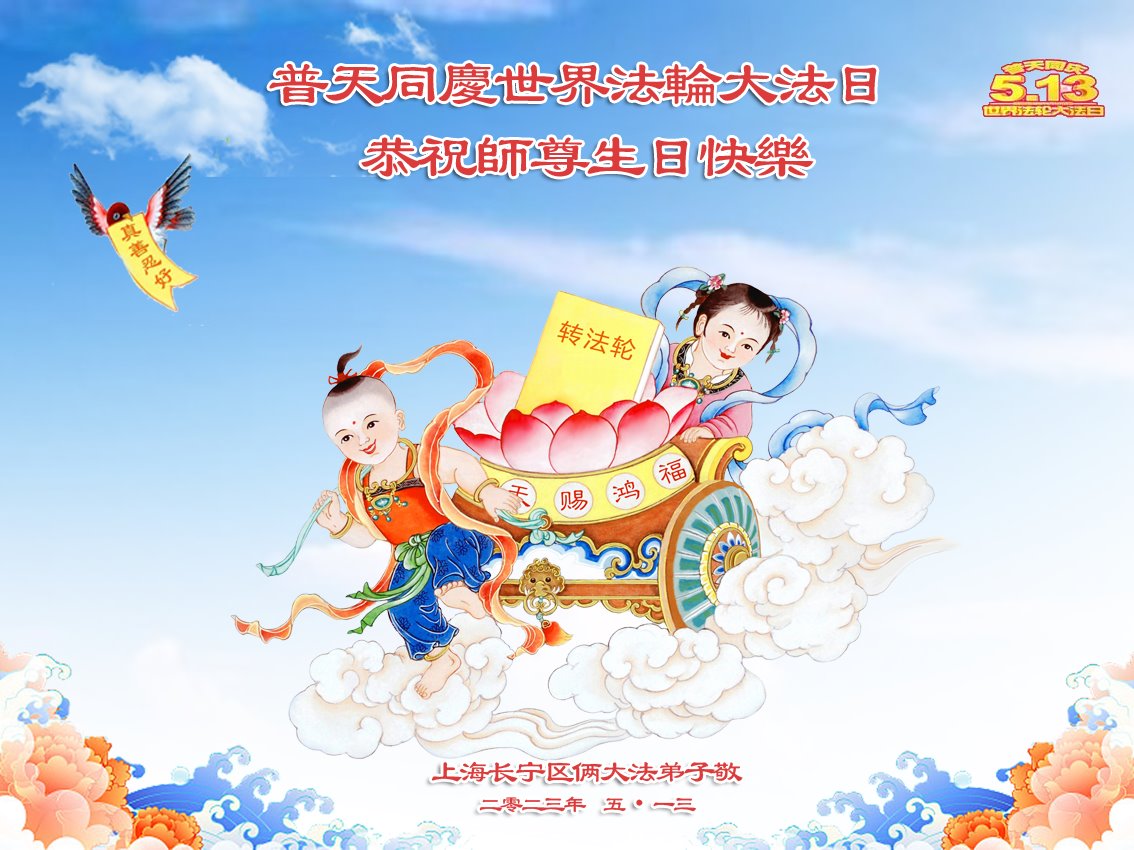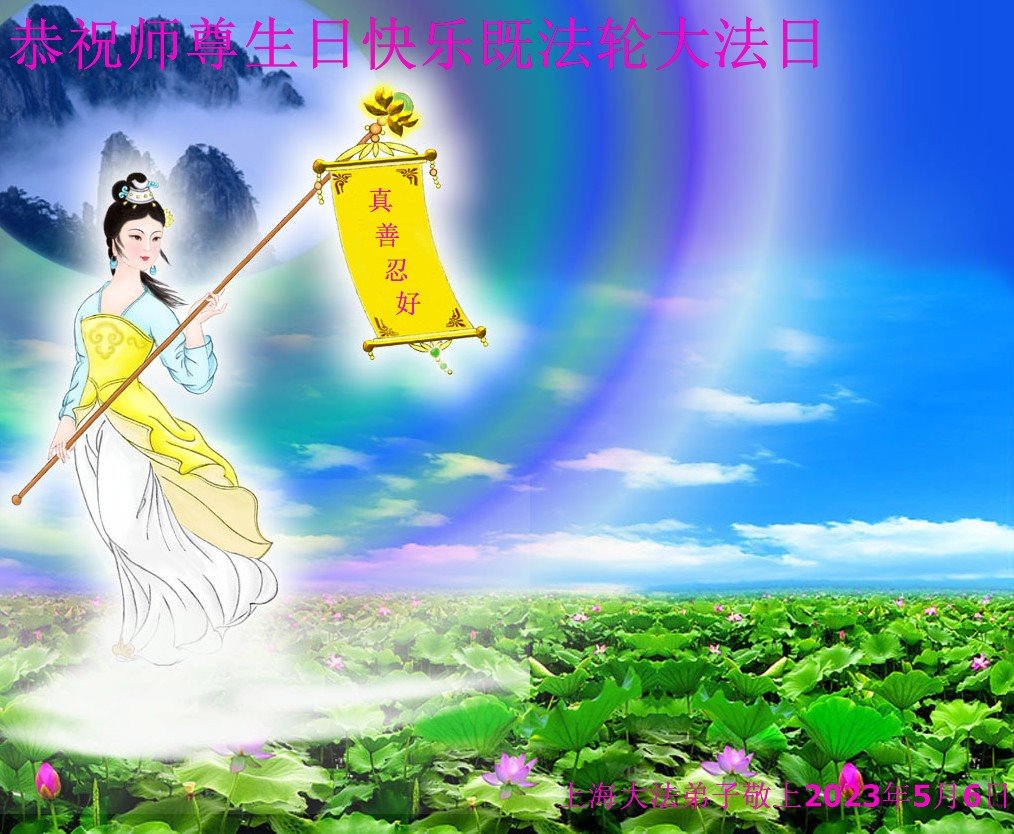 恭贺世界法轮大法日! 感恩师父洪恩浩荡慈悲救度,让大法弟子闯过一次次艰难险阻。我们一定珍惜万古机缘,修去名利情,救人世间行,真正精進实修,兑现誓约,不辜负师父的期望和众生的期盼! 上海大法弟子敬上 2023年5月6日 上海长宁区俩大法弟子恭祝师尊生日快乐!