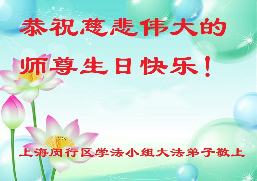 上海闵行学法小组大法弟子恭祝慈悲伟大的师尊生日快乐! 弟子坚修大法;助师正法,做好三件事,请师尊放心。 恭祝慈悲伟大的师尊生日快乐! 上海闵行学法小组大法弟子敬上 上海浦东新区学法小组大法弟子恭祝慈悲伟大的师尊生日快乐!