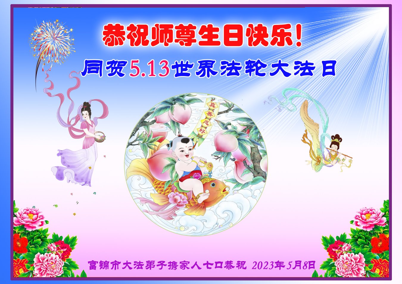 恭贺五一三法轮大法日!谢谢师尊苦度。弟子一定要修好自己,学好法做好三件事,多救人,跟师父回家!谢谢师父! 黑龙江省佳木斯市富锦市大法弟子携家人七口祝师父生日快乐!
