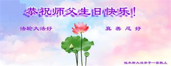 弟子在遥远的中国东北叩拜恩师:祝师父您生日快乐!师父您知道吗?弟子学法时有无数次的把师父看成是父亲,每当这个时候我就会泪流满面,我知道,您向慈父一样的在关心着弟子,您不但把弟子从地狱捞起,还替弟子偿还生生世世的一切罪业,给弟子的都是最好的,您领着弟子走在返本归真的路上,弟子完成自己的誓约。您的大恩大德弟子永远都无法报答,弟子唯有精進再精進,修好自己多救人。 黑龙江省佳木斯市一家三口大法弟子恭祝慈悲伟大师尊生日快乐!普天同庆世界法轮大法日!