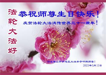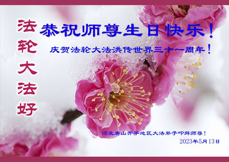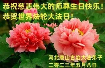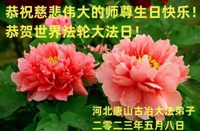 恭祝第二十四届世界法轮大法日! 在这普天同庆的伟大神圣日子里,弟子无限感恩师尊的慈悲救度!决心更好的完成使命,兑现誓约,返回家园。 河北省唐山市路北区一大法弟子敬上 二零二三年五月五日 河北省唐山市一大法弟子恭祝师尊生日快乐!