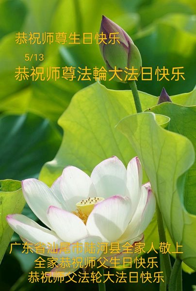 感谢师尊慈悲苦度!双手合十!叩拜师尊! 广东省惠州市惠东县一大法弟子及全家恭祝慈悲伟大的师尊生日快乐!庆贺世界法轮大法日!