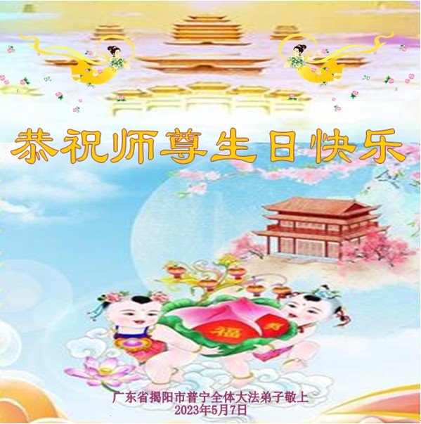 【明慧网二零二三年五月十二日】 广东省揭阳市普宁全体大法弟子恭祝慈悲伟大师尊生日快乐!普天同庆世界法轮大法日!