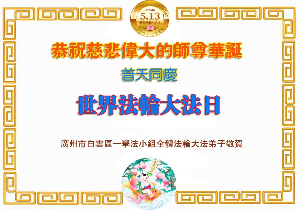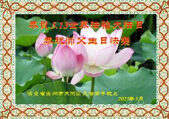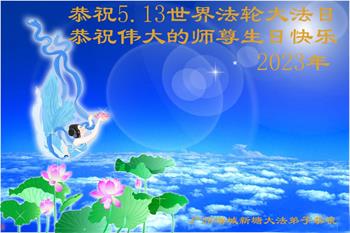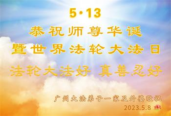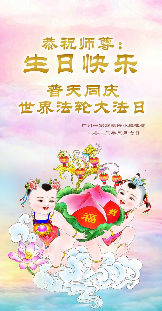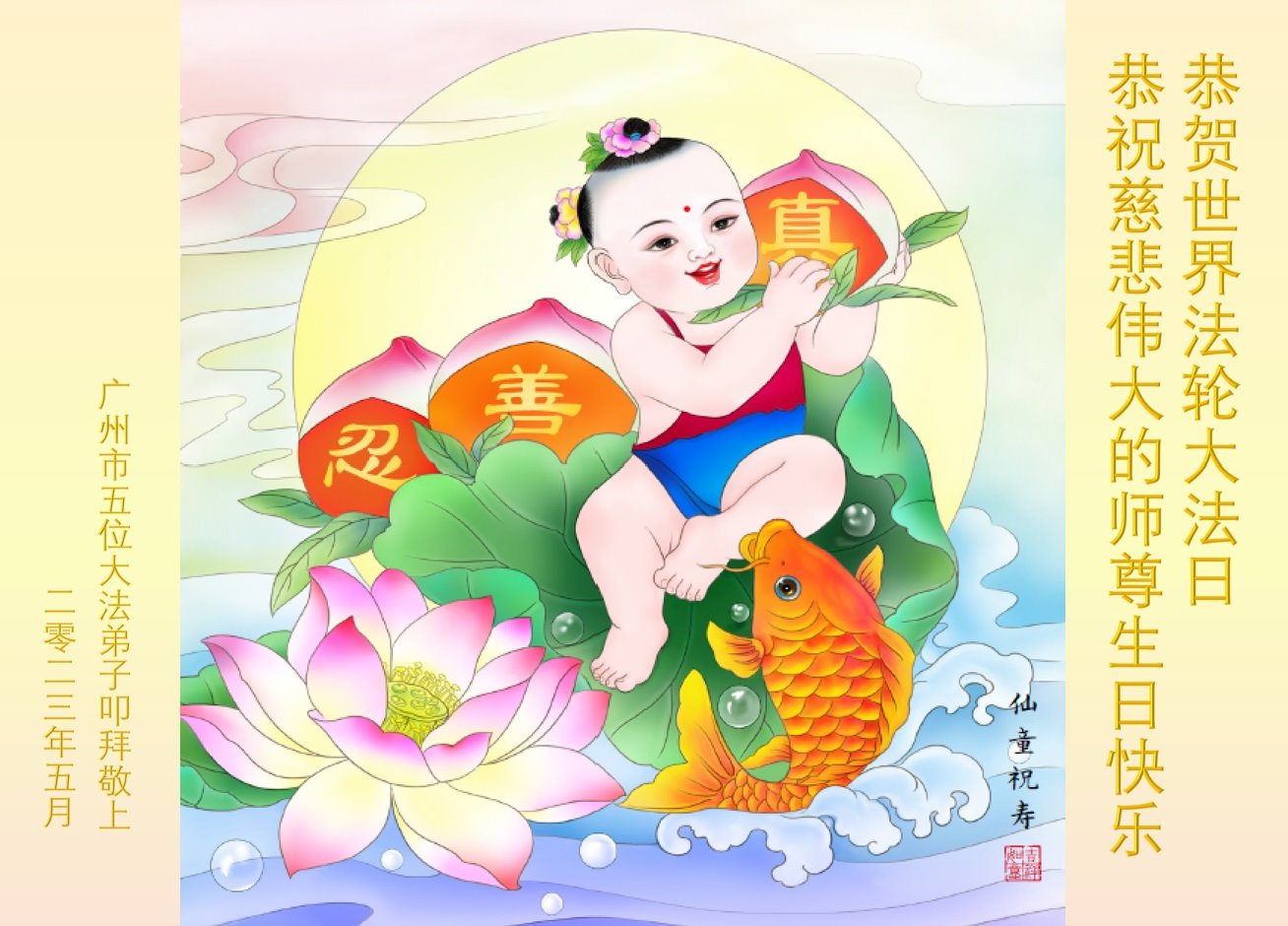 恭祝师父生日快乐! 金色五月来临,弟子叩拜师父,祝师父生日快乐!感恩师父的无量慈悲! 善良的世人都在醒来,祝愿所有的大法弟子帮助更多世人明真相,得救度。 广州大法弟子敬上 二零二三年五月一日 广州市一大法弟子恭贺法轮大法日!
