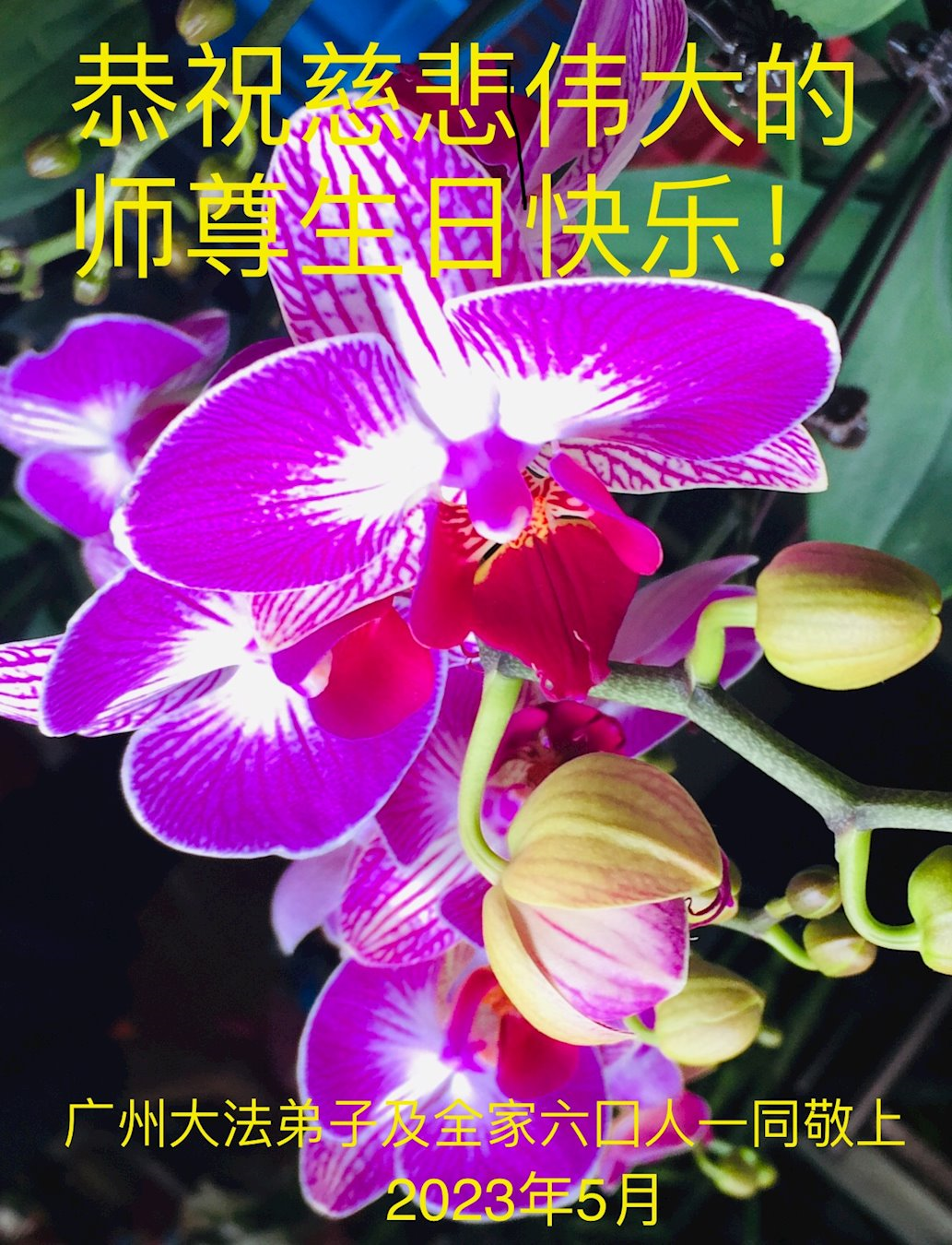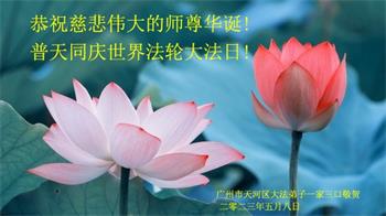 【明慧网二零二三年五月十二日】 广东省广州市天河区大法弟子一家三口恭祝慈悲伟大的师尊华诞!普天同庆世界法轮大法日!