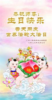 师尊您好!师尊您辛苦了! 感谢师尊慈悲救度,感谢师尊慈悲保护! 弟子唯有精進实修、跟上正法進程做好三件事、兑现誓约!才能不负师恩,弟子叩谢师尊!弟子在万里之外想念师尊。 广州大法弟子恭祝慈悲伟大的师尊生日快乐!庆贺世界法轮大法日! 广州大法弟子敬上 广东省广州花都全体大法弟子恭贺世界法轮大法日!恭祝师父生日快乐!