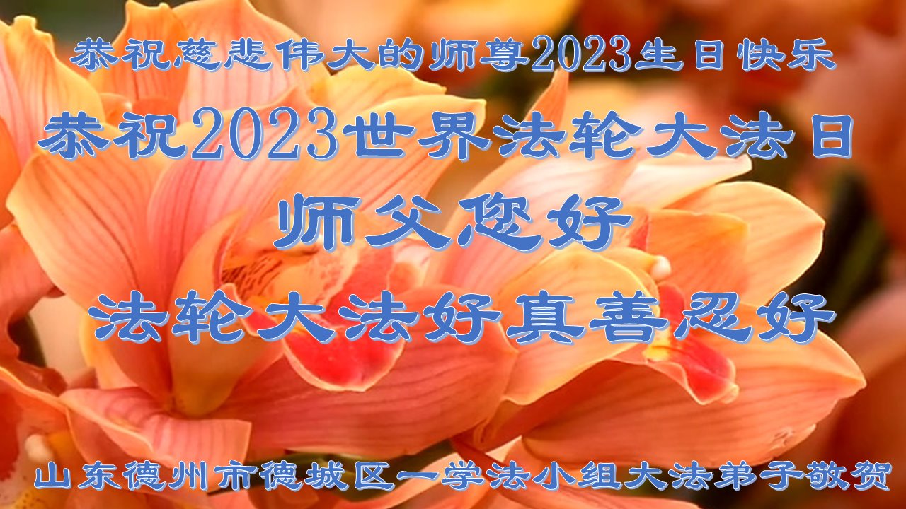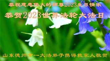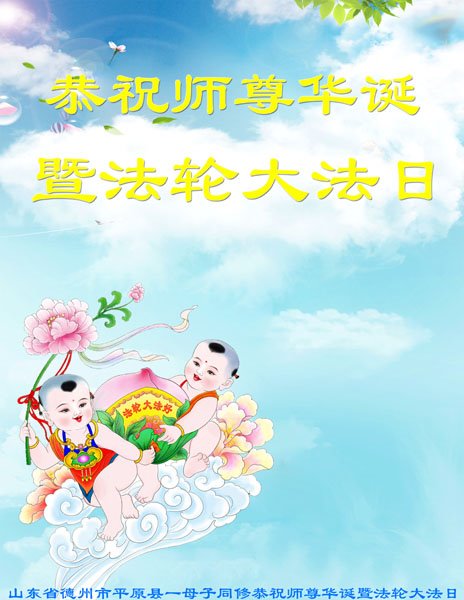 山东省乐陵市大法弟子祝贺2023年5月13日世界法轮大法日!祝师尊生日快乐! 乐陵全体大法弟子感谢师尊的救度,弟子代表被救度的世人表达最美的祝愿,谢谢师尊、生日快乐! 山东省德州市平原县一母子同修恭祝师尊华诞暨法轮大法日!