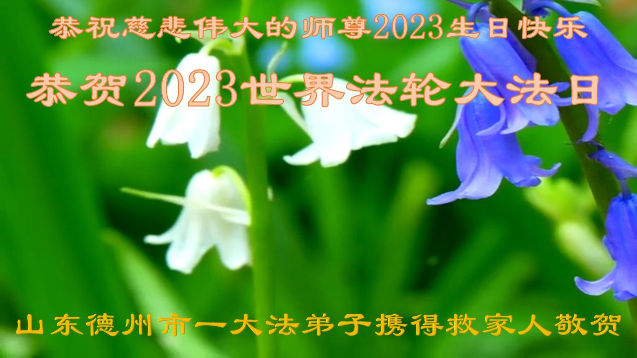 恭祝慈悲伟大的师尊华诞快乐!普天同庆5·13世界法轮大法日! 借一首《唱法轮大法好 全世界都知道》的歌曲表达弟子们对师父的无尽感恩! 一步一步往前走,不胆怯懦弱。 一遍一遍去执着,照师父说的做。 一遍一遍的难过,用来提高自我。 一关一关都能过,吃苦也能有笑容。 迷了路的时候,有大法指引我,让真善忍的光,撒遍世界每一个角落! 法轮大法好,真善忍好!让全世界知道! 山东德州陵城区全体大法弟子叩谢师恩! 2023年5月8日 山东省德州大法弟子一家恭贺法轮大法日!恭祝师父生日快乐!
