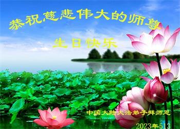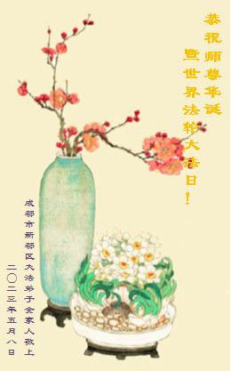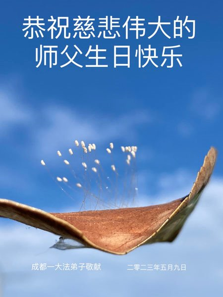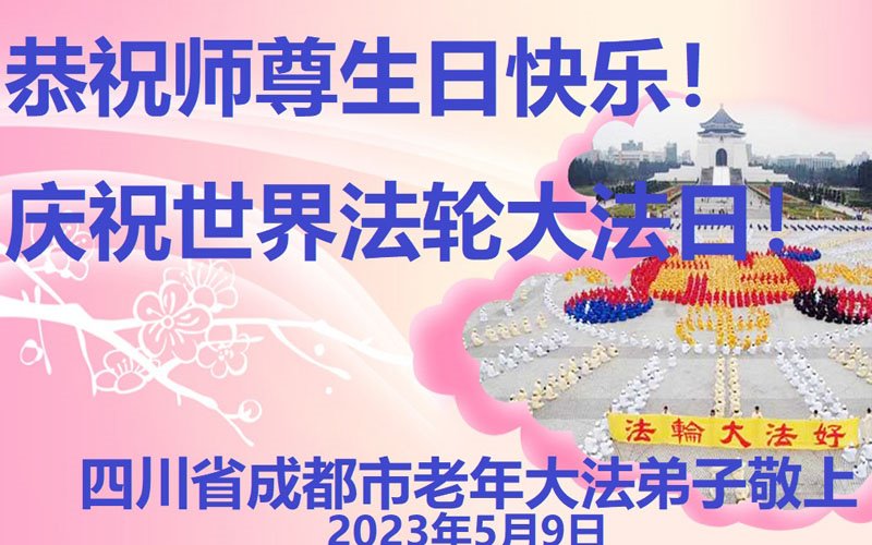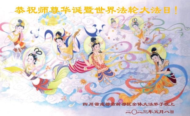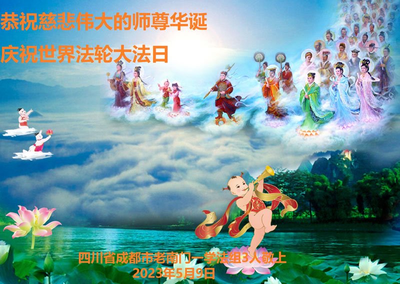 【明慧网二零二三年五月十二日】 四川省成都市新都区全体大法弟子恭祝师尊华诞暨法轮大法日!