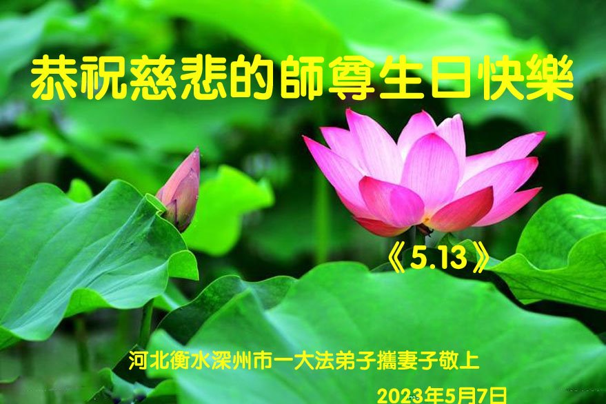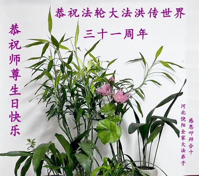 又到了一年一度的世界法轮大法日暨师尊华诞,今年的五月十三日是第二十四届世界法轮大法日,也是法轮大法洪传三十一周年的日子。在这特别的日子里,弟子一定修好自己,多学法,多救人,跟师父回家。 河北省衡水市深州市学法小组大法弟子恭祝师尊生日快乐!