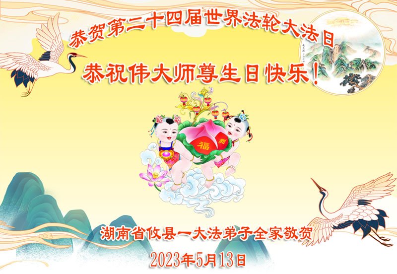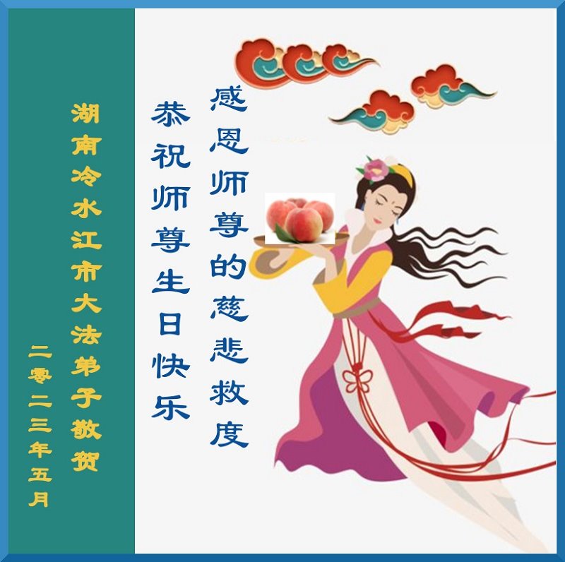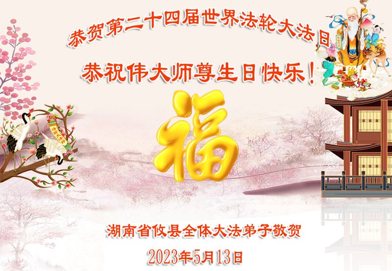 【明慧网二零二三年五月十二日】 湖南郴州市宜章乡下一大法弟子恭祝慈悲伟大的师尊华诞!恭贺世界法轮大法日!