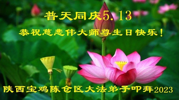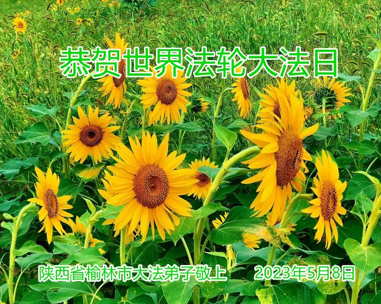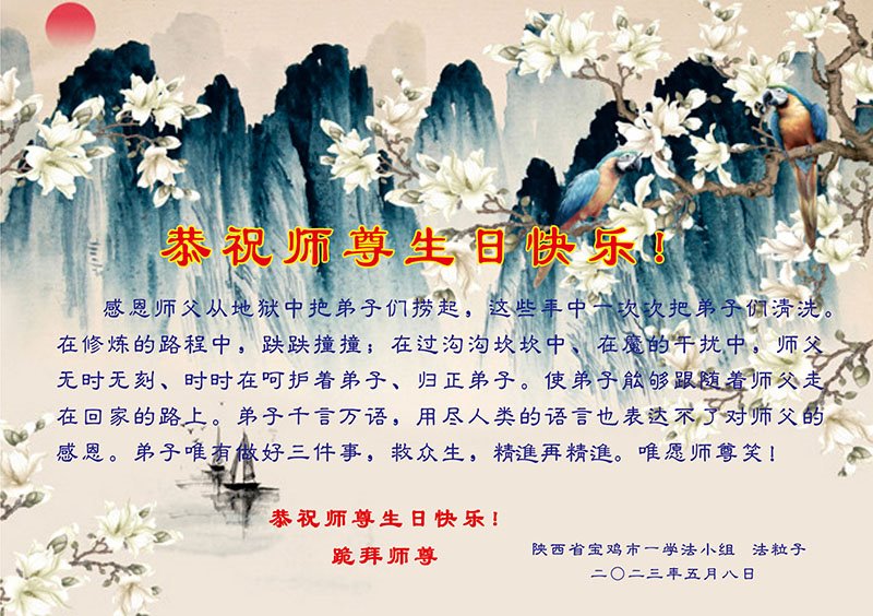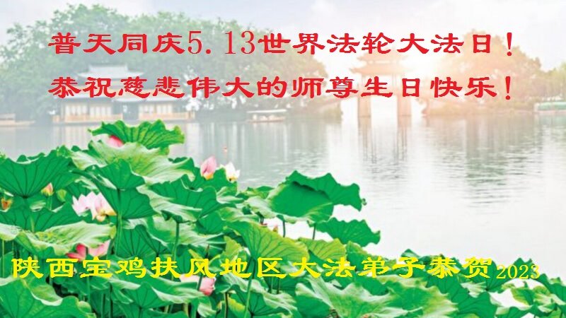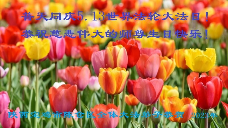 【明慧网二零二三年五月十二日】 陕西宝鸡市一学法小组大法弟子恭祝师尊生日快乐!恭贺世界法轮大法日!