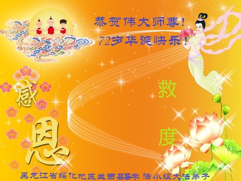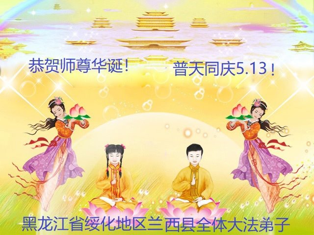 在未来的岁月里我们要共同精進,珍惜修炼的机缘,做好三件事,助师多救人。全县大法弟子们叩谢师尊慈悲救度! 黑龙江省绥化地区兰西县全体大法弟子恭祝慈悲伟大的师尊生日快乐!庆祝世界法轮大法日!